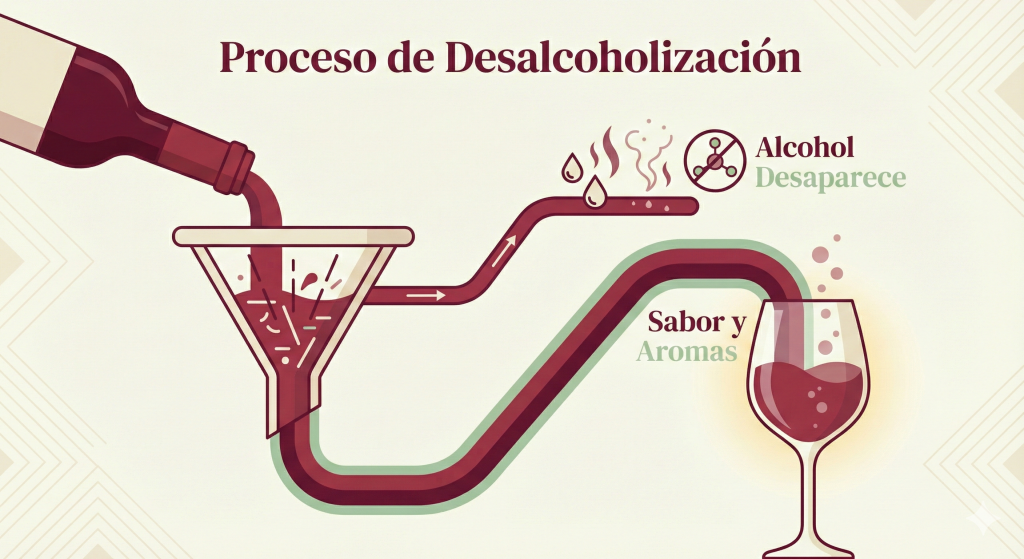 ¿Cómo se logra? No es simplemente jugo sin fermentar. Se trata de vino real que pasa por un proceso de fermentación tradicional para desarrollar sus aromas complejos, y luego, mediante técnicas delicadas como la ósmosis inversa o la destilación al vacío, se retira el etanol preservando el sabor.
